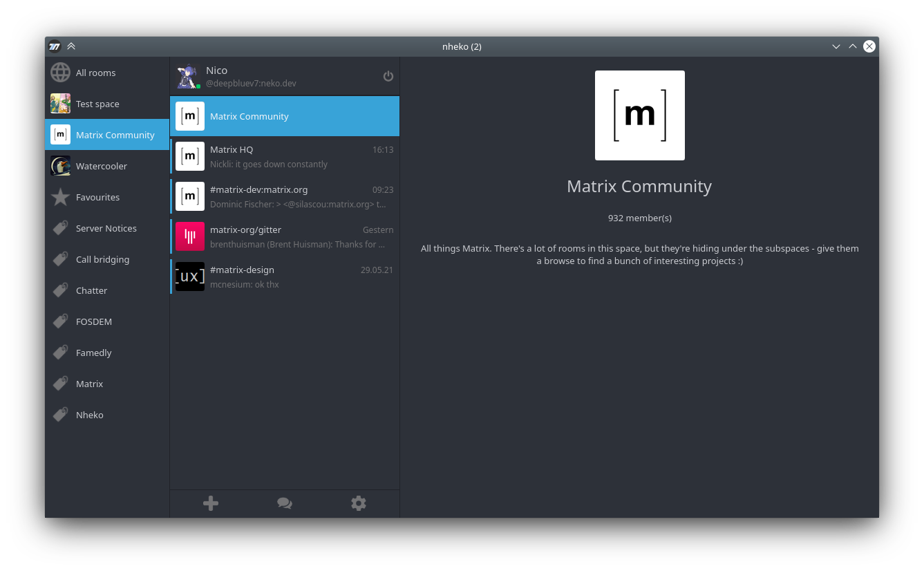 We merged the Spaces branch, which means Nheko master can now show some spaces. Peeking unjoined rooms, nesting spaces and creating them should be coming soon. We are also looking into how to fit knocking into the UI (we already rendered incoming knocks in the timeline for a while).