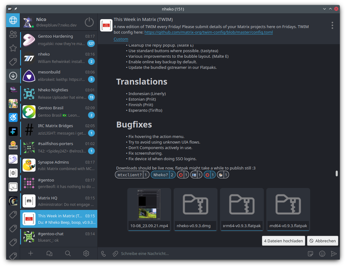 Bulbu also went through a lot of effort to add a second set of emoji shortcodes to Nheko. Those should be more familiar to people coming from other platforms or clients while the old shortcodes are available still as well. We also saw a lot of progress on the Finnish, Chinese, Indonesian and Russian translations, animated images should work properly in the image viewer again, buttons for opening the member list are now clearly marked with a people icon next to them. The memberlist is also now search- and sortable.