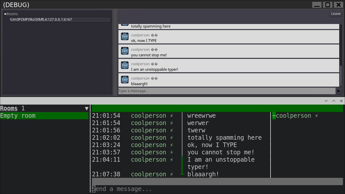 Godot-Matrix is a C++ module for connecting to Matrix from the Godot Game Engine. I refurbished it and the changes made it upstream now ^_^, thx vurpo! :