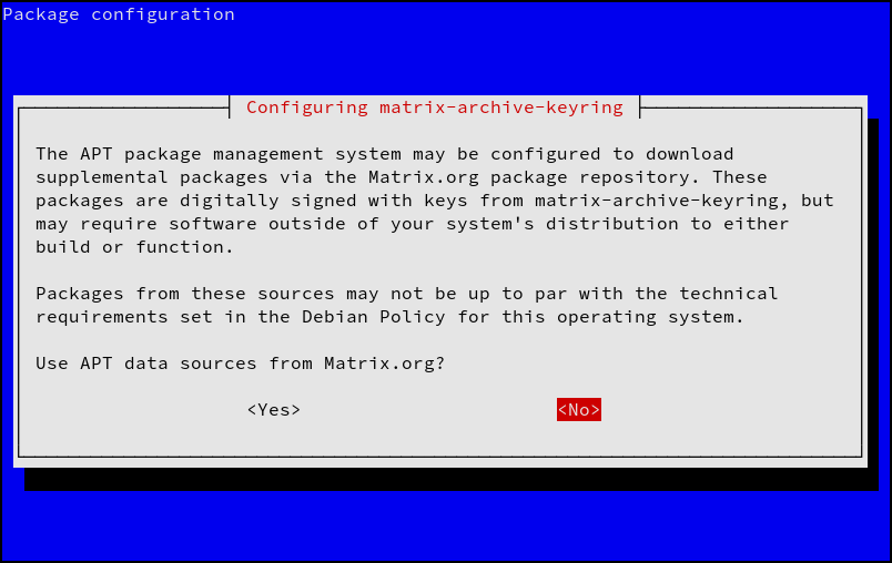 We can ask you withdebconfif you want to installdeb https://matrix.org/packages/debian $(lsb_release -cs) mainto/etc/apt/sources.list.d/matrix-org.listwhile you're installing the new keyring withapt install matrix-archive-keyring.